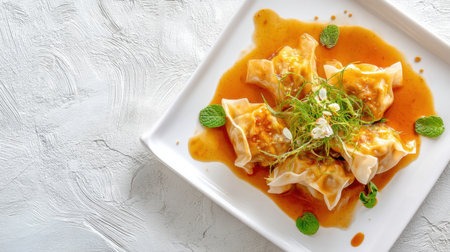 A stunning display of Asian-style dumplings drizzled with savory sauce, decorated with fresh herbs for a mouthwatering culinary delight. A feast for the senses!