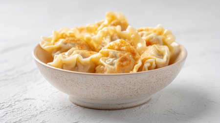 A shallow bowl filled with freshly cooked dumplings showcases the art of Asian cuisine. This image highlights the warmth and comfort of these savory treats.