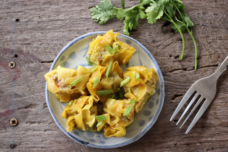 Yellow dumpling. Stuffed with minced pork . Concept, Traditional food. Appetizer for a party or serve as main dish. Delicious and healthy food