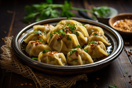AI Generated. Delicious plate of steaming dumplings served in a decorative bowl garnished with herbs