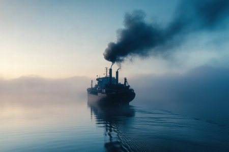 A massive oil tanker crosses tranquil ocean waters, releasing smoke from its chimneys into the serene morning atmosphere.