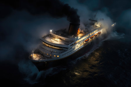 Cruise ship in the middle of the sea with smoke from chimneys