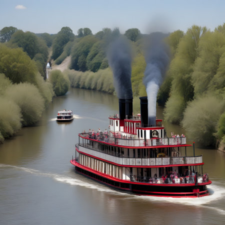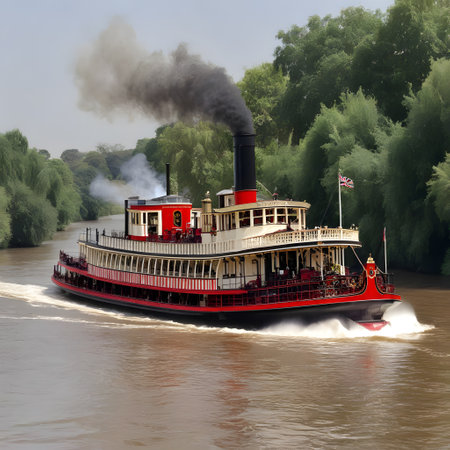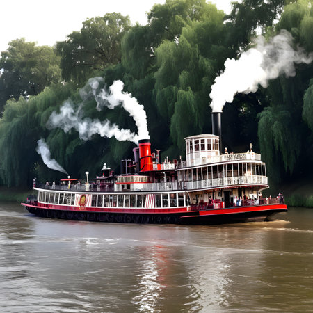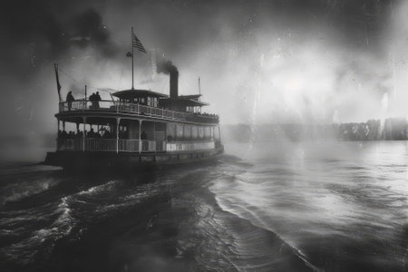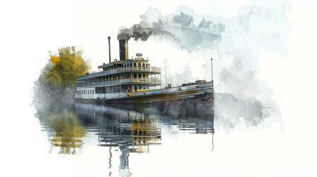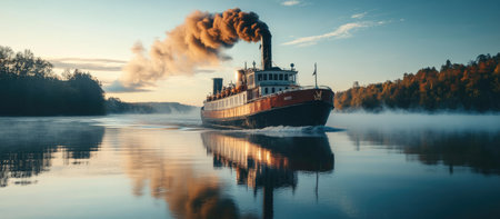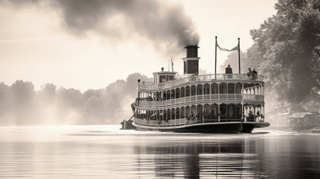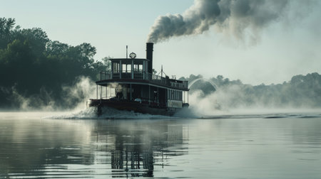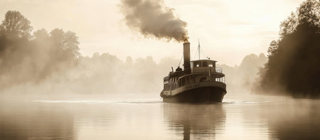 A captivating and picturesque scene of a majestic steamboat gracefully navigating through a foggy river landscape. Generative AI