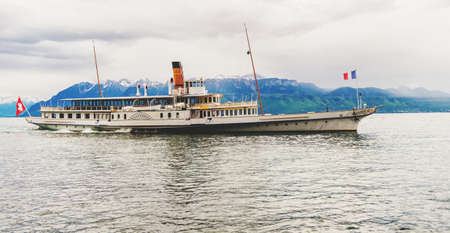 Steam boat with swiss and french flags floating on Lake Geneva or Lac Leman