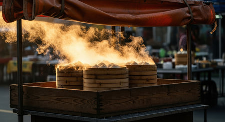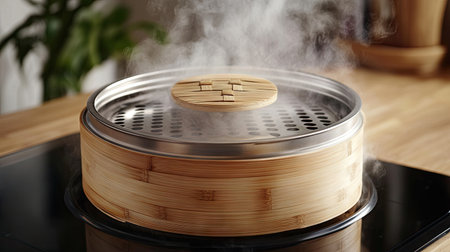 A bamboo steamer sits on a stovetop emitting steam, creating a warm and inviting atmosphere. Perfect for showcasing Asian cooking and culinary practices.
