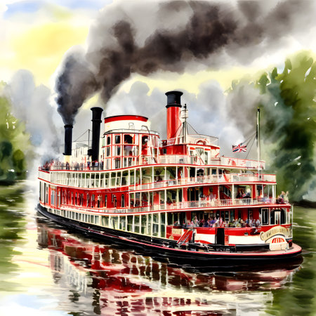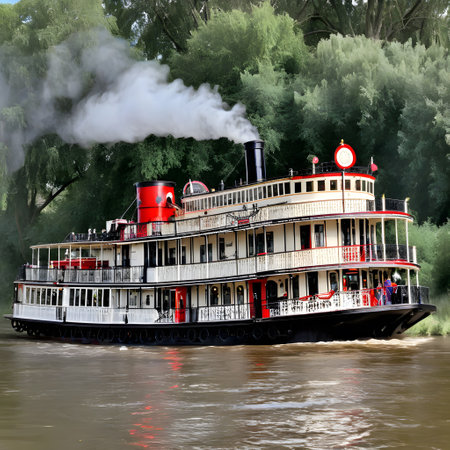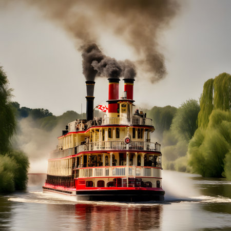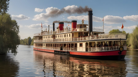 A classic steamship cruising through a calm river, with smoke billowing from its tall chimneys. . --ar 16:7 --v 6.1 Job ID: 6bb9d570-85e7-4e20-82ea-5b91e08f022d