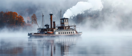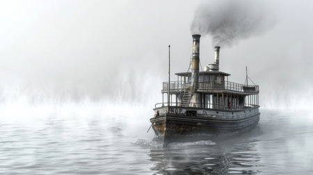 A vintage steamboat with smokestacks billowing steam travels through a foggy lake. The vessel is in the center of the frame, with the fog obscuring the surrounding landscape and creating a sense of mystery and nostalgia.