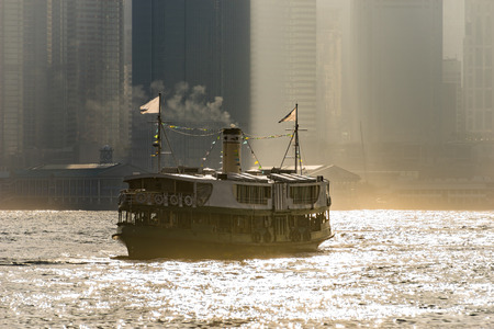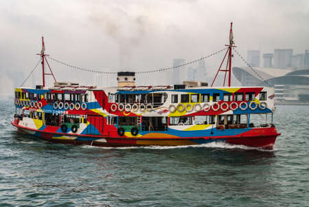 Hong Kong, China - May 14, 2010: Closeup of Multi-color, older ferry vessel crosses Victoria harbour with Skyline of Hong Kong Island faded in the fog.