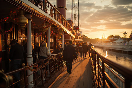 Boarding animated on a luxurious ship at sunset., generative AI