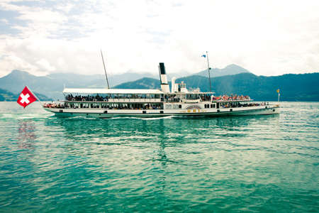 Beautiful steamship on the Lake Lucerne surrounded by Swiss Alps, Central Switzerland