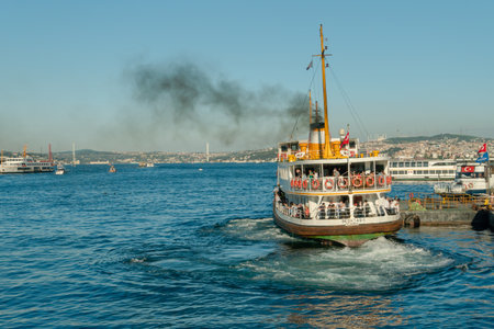 Ferry boat with people departures from harbor in Istanbul, Turkey. Public transport in turkish city.