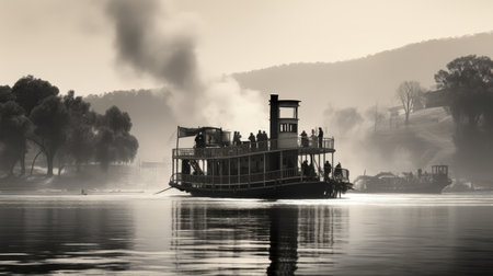 Monochromatic Steamboat on River paddlewheel boat