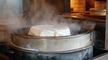 A captivating scene of steam rising from a bamboo steamer containing soft tofu, showcasing traditional cooking methods in a vibrant kitchen.