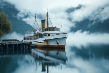 Old steamship is docked at a wharf on a misty lake with mountains in the background, creating a serene and nostalgic atmosphere