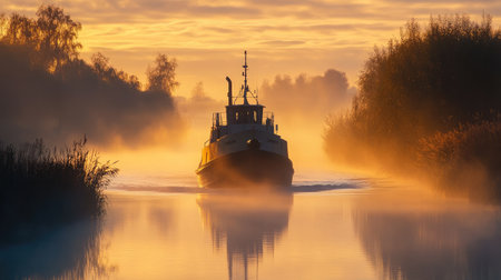 A vintage boat glides through a misty waterway at dawn, surrounded by soft reflections and lush greenery, creating a serene and tranquil atmosphere bathed in warm golden light.