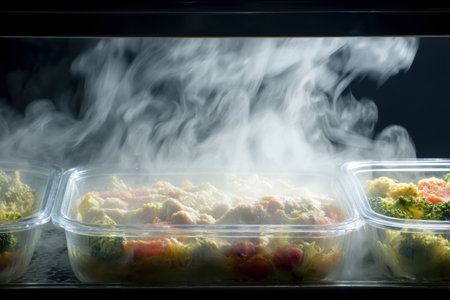Steam billows from a freshly heated frozen dinner, revealing vibrant vegetables in a clear container as it warms up.