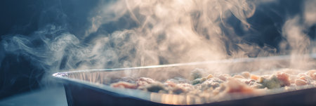 Steaming hot dish close-up with aromatic vapors in sunlit kitchen scene. High quality illustration