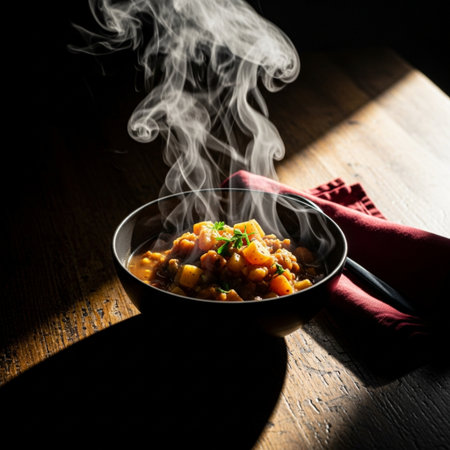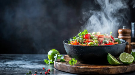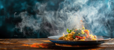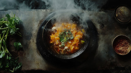 A dramatic cooking moment captured with rising steam, fresh herbs, utensils, and spices on a rustic table. The smoky atmosphere adds a dynamic touch.