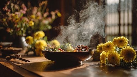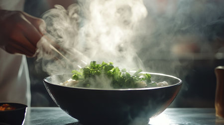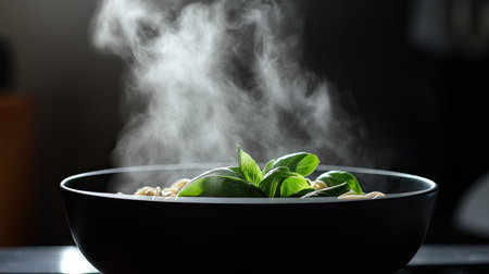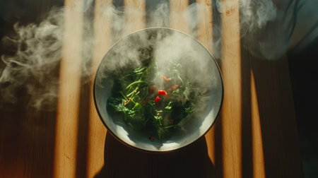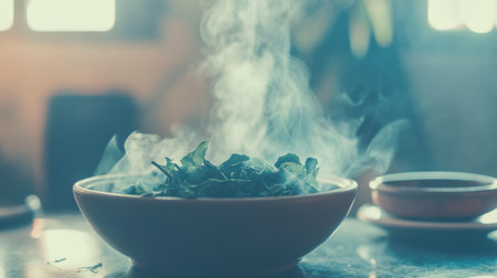 A captivating image of a steaming bowl filled with fresh herbs, exuding warmth and comfort in a cozy kitchen. Soft light enhances the serene ambiance.
