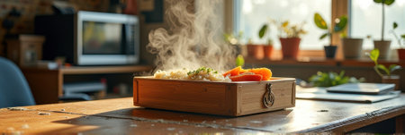 Steaming rice and vegetables in wooden box on sunny kitchen table. That the image is generated using AI.