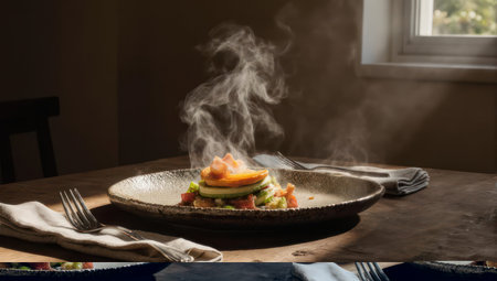 A beautifully plated gourmet dish steams on a rustic wooden table, bathed in sunlight near a window, creating a warm and inviting culinary scene.