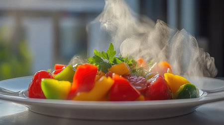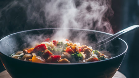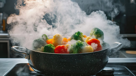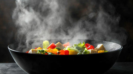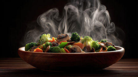 Steaming bowl of colorful vegetables including broccoli, carrots, and mushrooms, creating warm and inviting atmosphere. steam rising adds sense of freshness and deliciousness