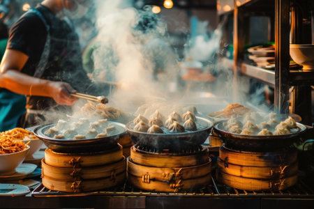Savor the essence of culinary artistry with this atmospheric snapshot of steaming dumplings, capturing the vibrant soul of street food. Immerse yourself in the misty allure of fresh, authentic flavors. Taste of culture. Generated A.I.