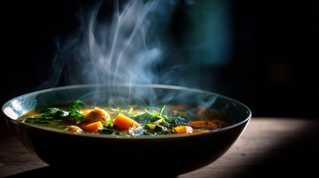 Warm vegetable soup steams in a bowl on a wooden table in soft lighting