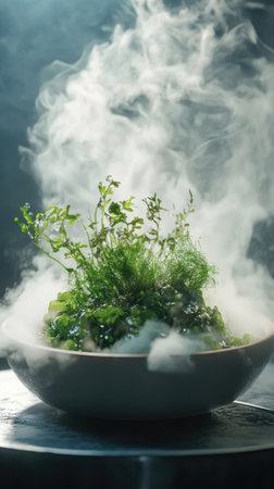 A gourmet vegetable dish beautifully plated with fresh greens and colorful vegetables, enhanced by a mesmerizing smoke effect, perfect for food photography or culinary inspiration.