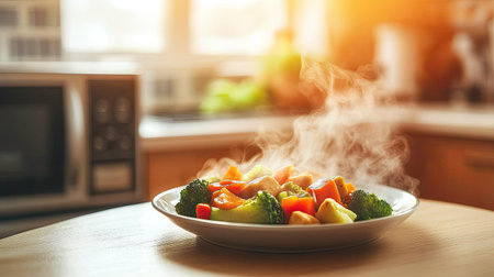A steaming plate of organic vegetable stir-fry with tofu is set near a silver microwave on a clean wooden dining table.