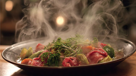 A close-up of a steaming dish of hot soup, with aromatic smoke rising and adding to the appetizing scene