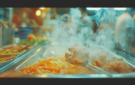 A vibrant scene of steaming dishes in a cozy restaurant kitchen, showcasing fresh ingredients and enticing aromas, perfect for food lovers and culinary enthusiasts.
