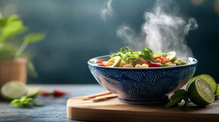 This image features a steaming bowl of freshly prepared food, garnished with vibrant herbs and a slice of lime, evoking a warm culinary atmosphere.