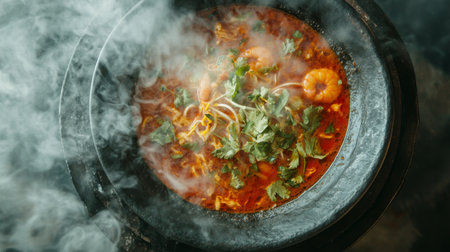 A vibrant bowl of tom yum goong captures the essence of Thai cuisine. Steam rises from the fragrant soup, adorned with fresh herbs and lime. Perfect for food lovers.