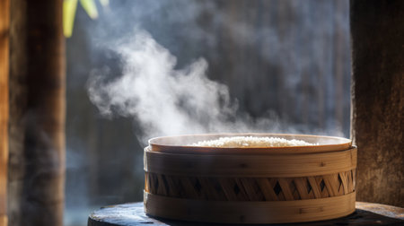 A close-up of a bamboo steamer basket with hot, steaming rice inside, with a rustic background and visible grains, showcasing traditional cooking methods.