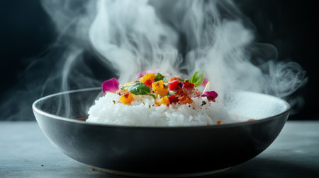 An artistic shot of white rice presented in a polished bowl, with steam gently rising and colorful ingredients surrounding it for a vibrant culinary scene.