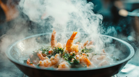 A steaming dish of fresh shrimp mixed with vibrant herbs and spices. This culinary scene captures the essence of flavorful cooking and gourmet preparation.