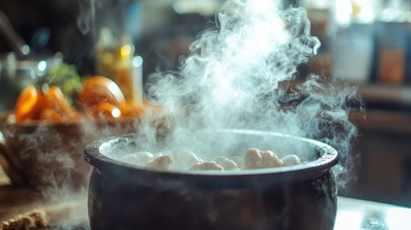 A close-up of smoke escaping from a bubbling cauldron in a kitchen, creating a sense of culinary magic and warmth, with ingredients in the background.