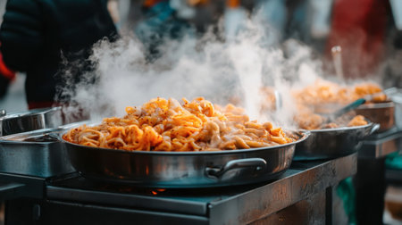 A lively street food scene featuring steaming pots of fresh pasta dishes. The vibrant colors and aromas create an appetizing culinary experience for passersby.