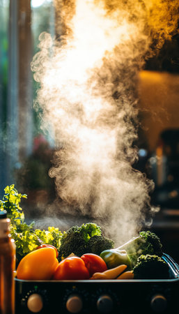 A metallic pot filled with colorful vegetables emits steam, sitting on a kitchen counter bathed in natural light. Green plants are visible in the background, enhancing the homey atmosphere.