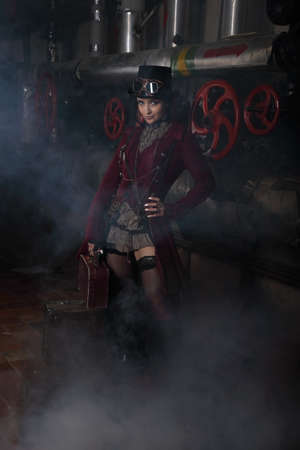 Young beautiful steampunk woman with suitcase in hand shrouded in steam over industrial background with pipes and valves