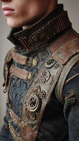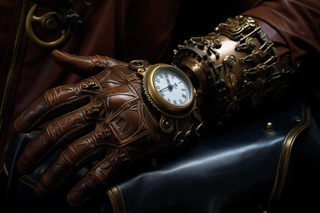 Steampunk fashion: male holding intricate brass gear in gloved hand.