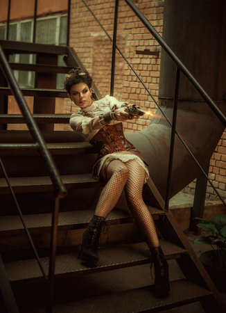 Portrait of a girl in a steampunk style. She is dressed in cool, unusual clothes. The photo shows shooting from an old gun. Creative colors