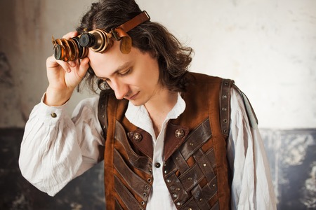 Steampunk pilot in a leather vest and flight glasses on his forehead. Vintage style man in glasses goggles