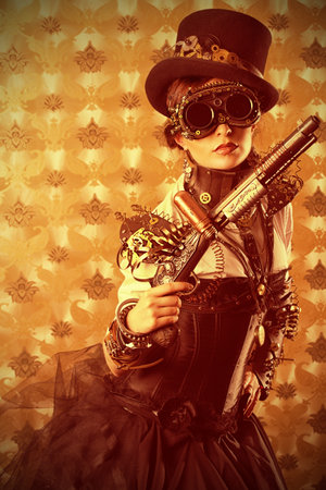 Portrait of a beautiful steampunk woman holding a gun over vintage background.