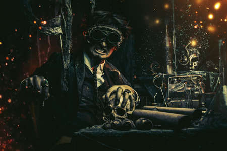 Scientist steampunk man inventor works in his laboratory with Victorian interior. Adventure world of steampunk.