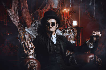 Halloween. Frightening gloomy man in a black tailcoat sits in an armchair with a skull in an old abandoned castle. The Dark Lord. Vampire man.