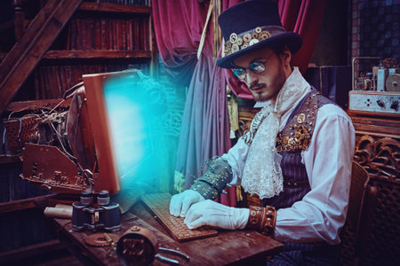 Handsome steampunk man scientist inventor works in his laboratory with Victorian interior.