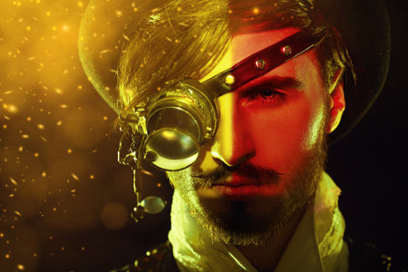 Close-up portrait of a courageous steampunk man with monocular on a black background with sparks of flame.