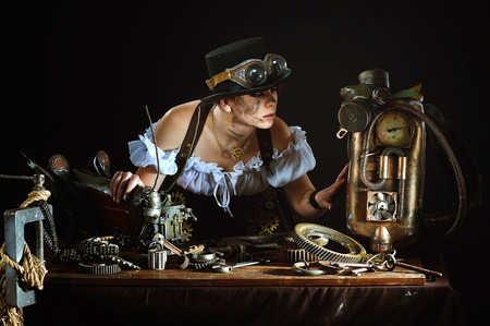 Steam-punk girl portrait. fantasy portrait. The girl mechanic with your metal friends